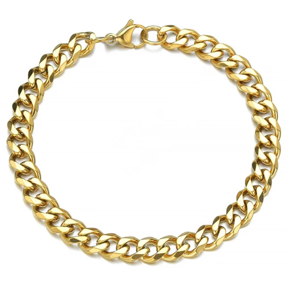 Stainless Steel Cuban Link Bracelet. 5mm thick. 18cm long. Gold color.